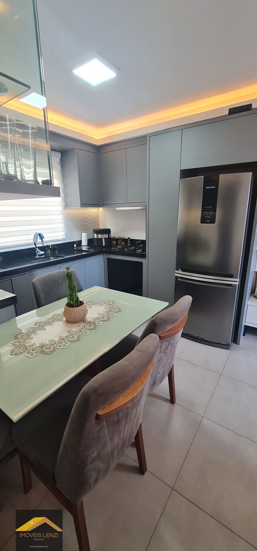 Armários planejados na cozinha com mesa com 04 cadeiras, painel de tv na sala, cortinas, lavanderia, armários nos quartos, bwc com armário e box.